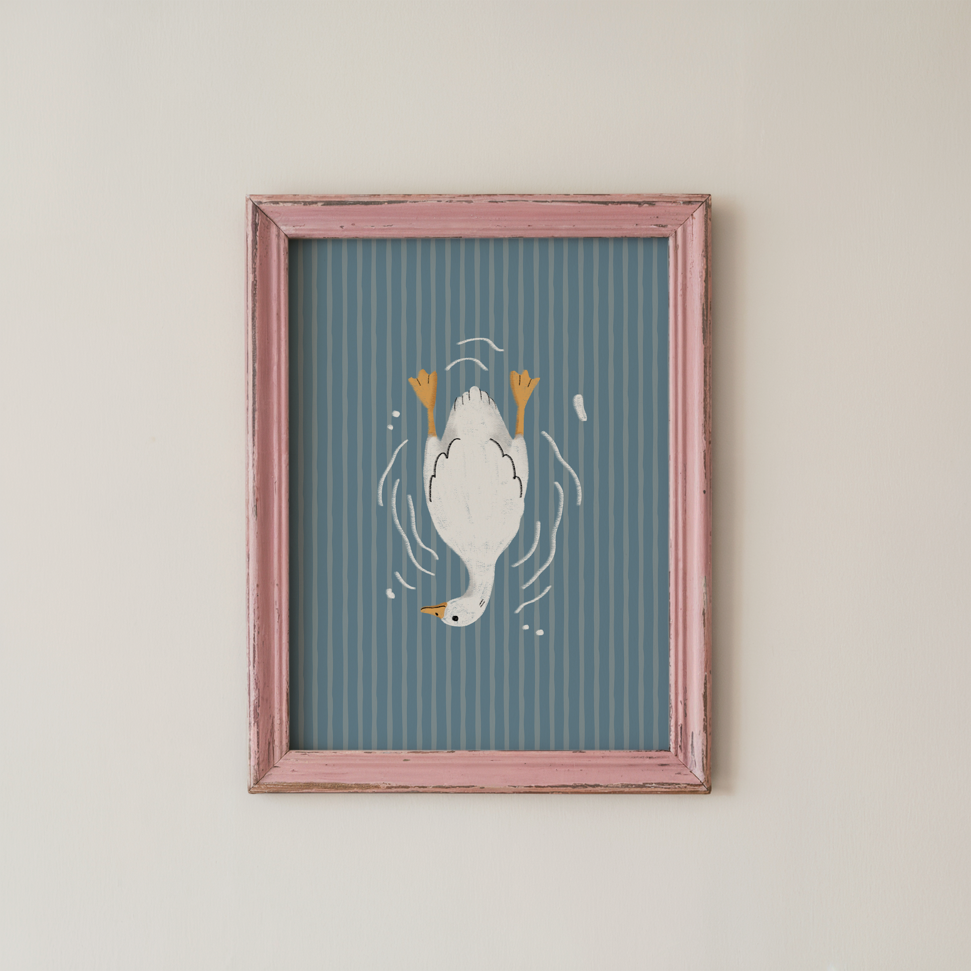 Make your bathroom feel instantly more playful with this Goose Bathroom Wall Art featuring a white goose diving underwater with feet up, surrounded by hand-drawn splash lines. It is a simple, funny illustration that adds charm to everyday spaces and makes guests do a double take.
