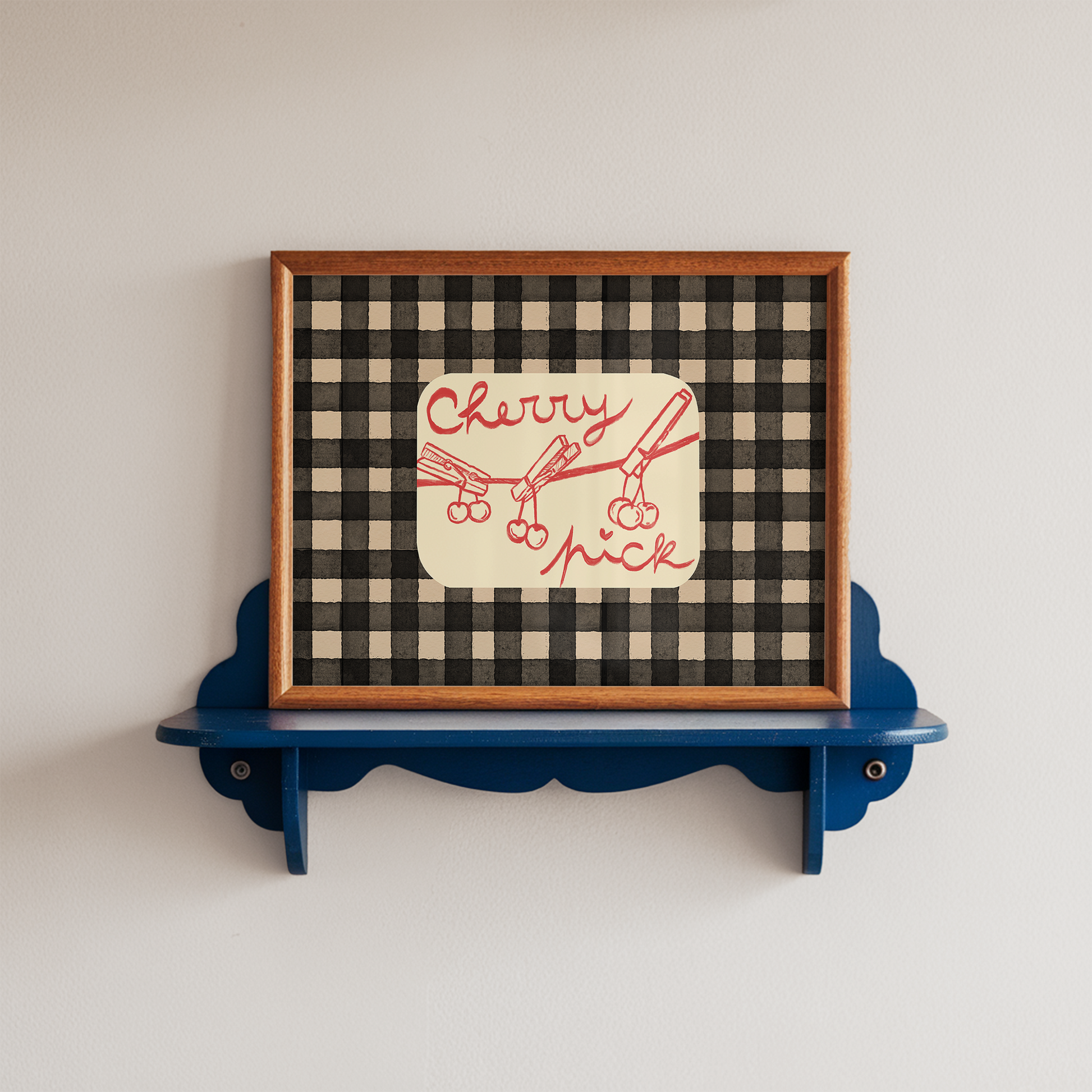Add a playful pop to your space with this kitchen wall art print featuring hand-drawn cherries and the phrase “Cherry Pick” in bold red script.