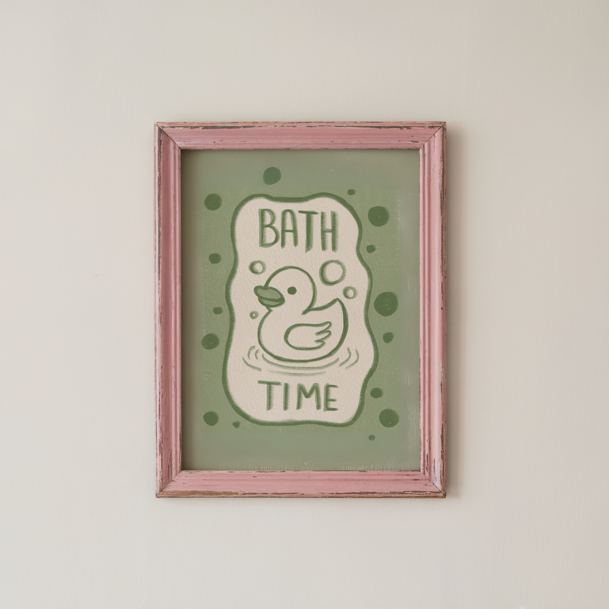 Make bath time feel extra sweet with this playful bathroom wall art print featuring a cute rubber duck and bubbly details. The design includes the words “BATH TIME” for a charming, kid friendly touch.