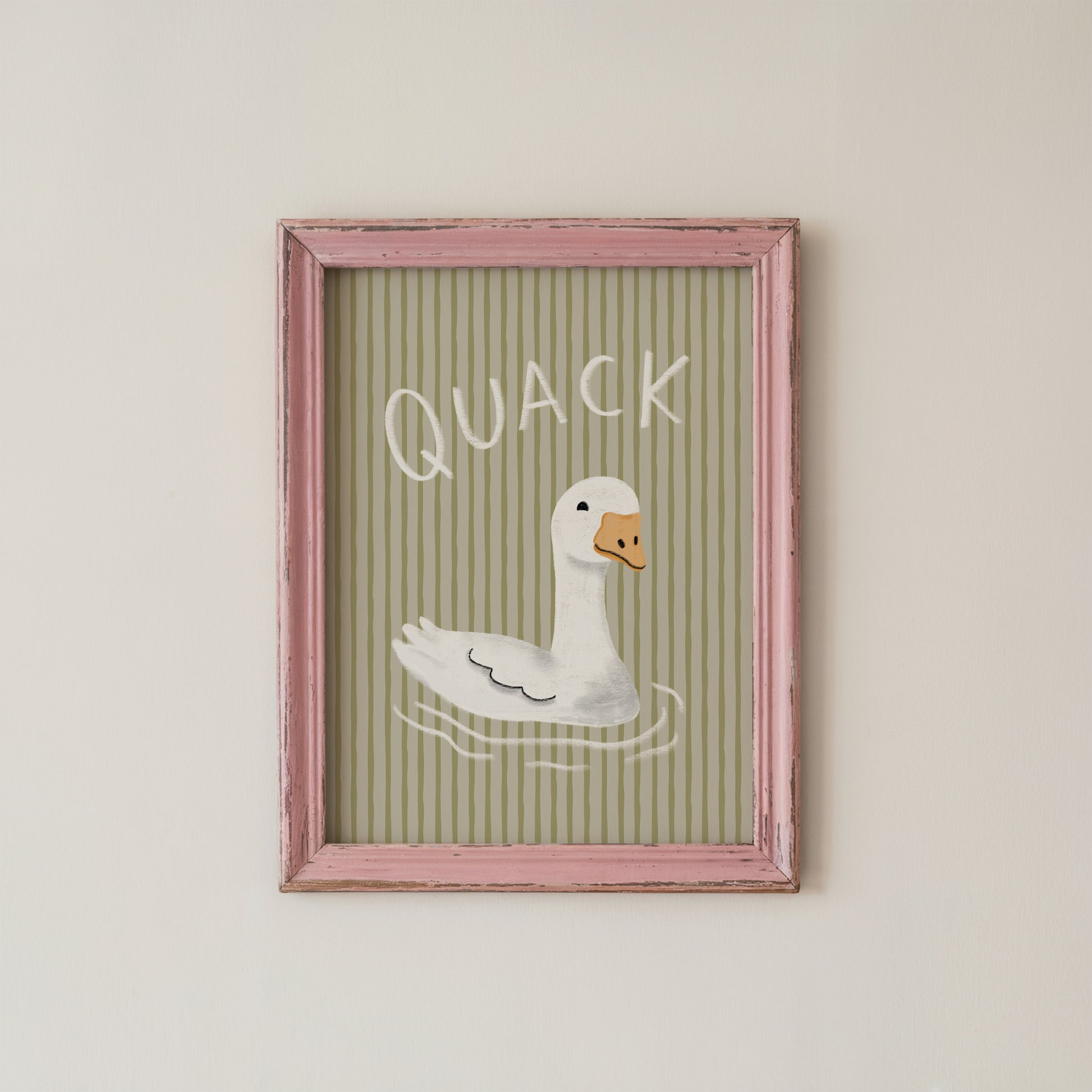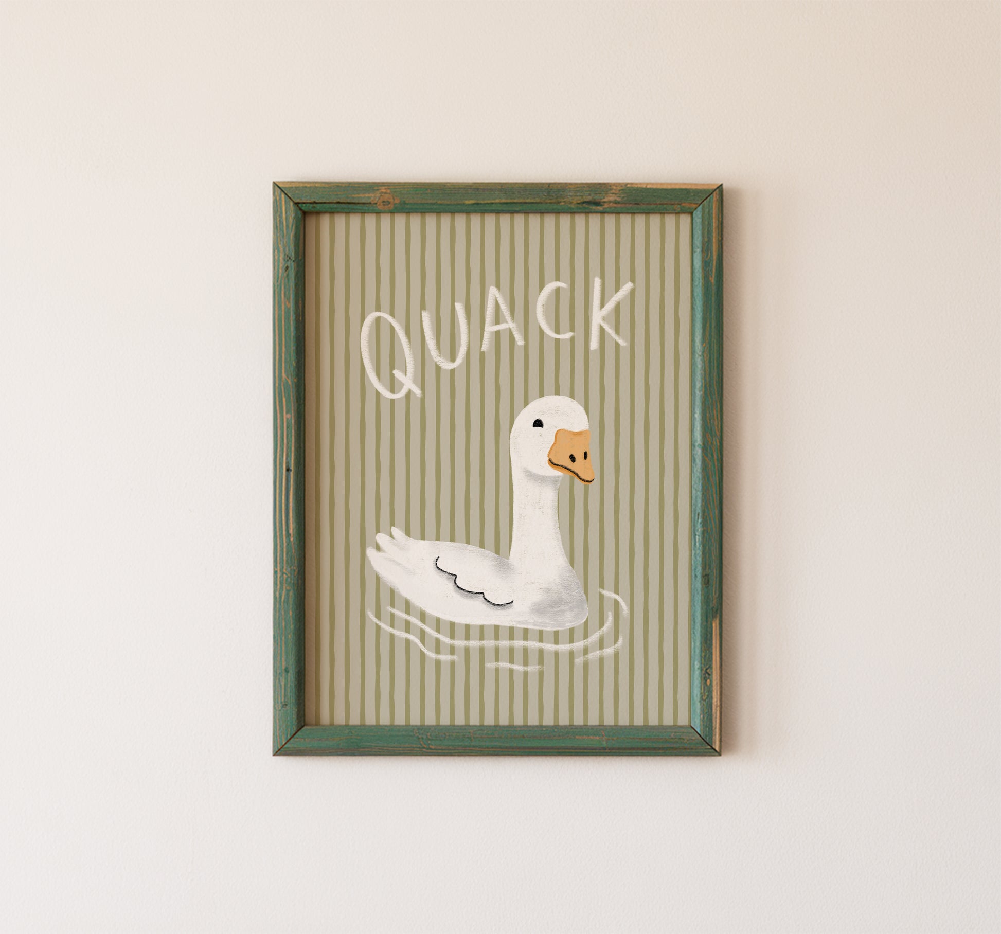Make your space feel lighter and more playful with this funny duck wall art print featuring the word “QUACK” in bold hand-drawn lettering above a floating white duck. Gentle ripple lines and a soft sage green striped background give the design a calm, modern look while keeping the mood silly and fun.
