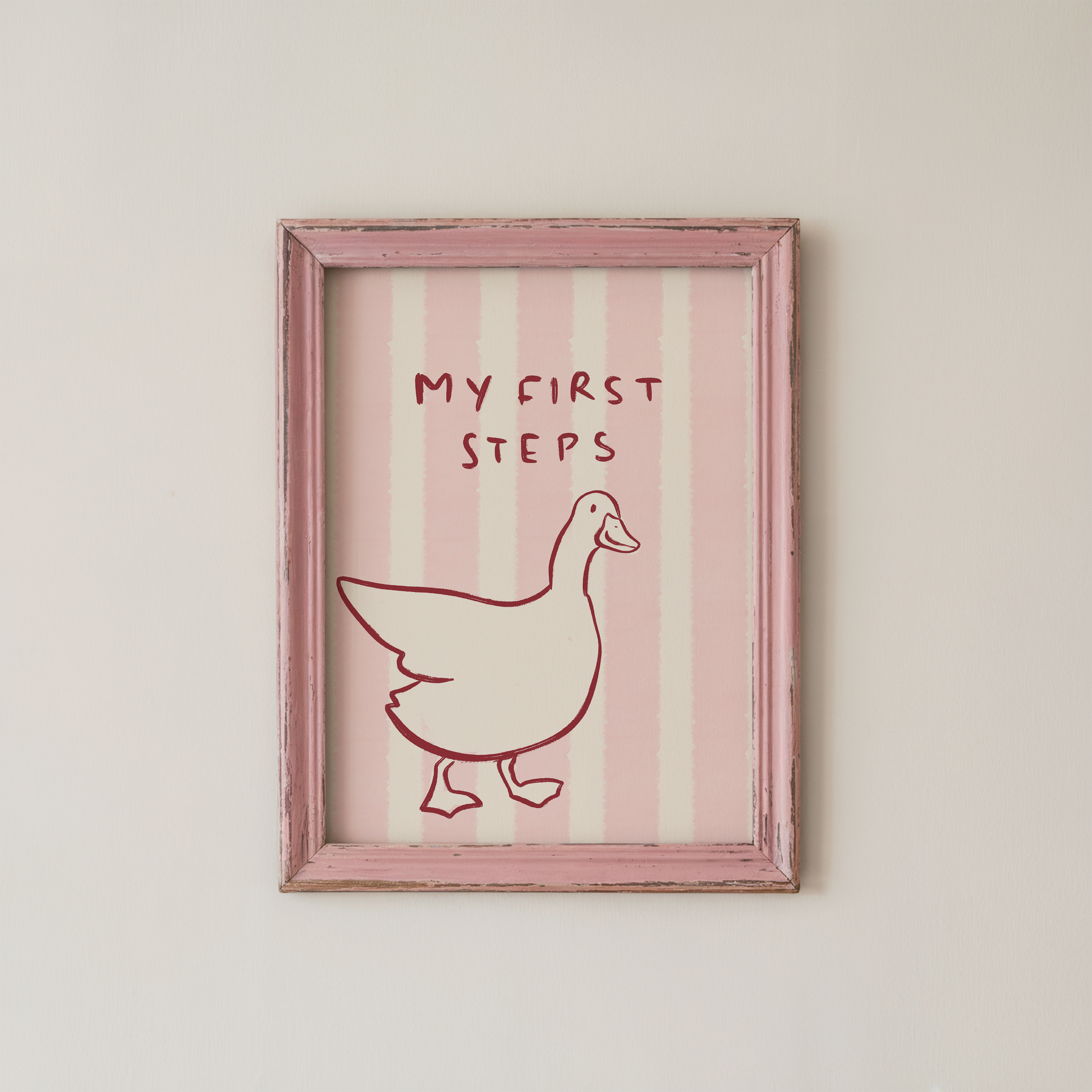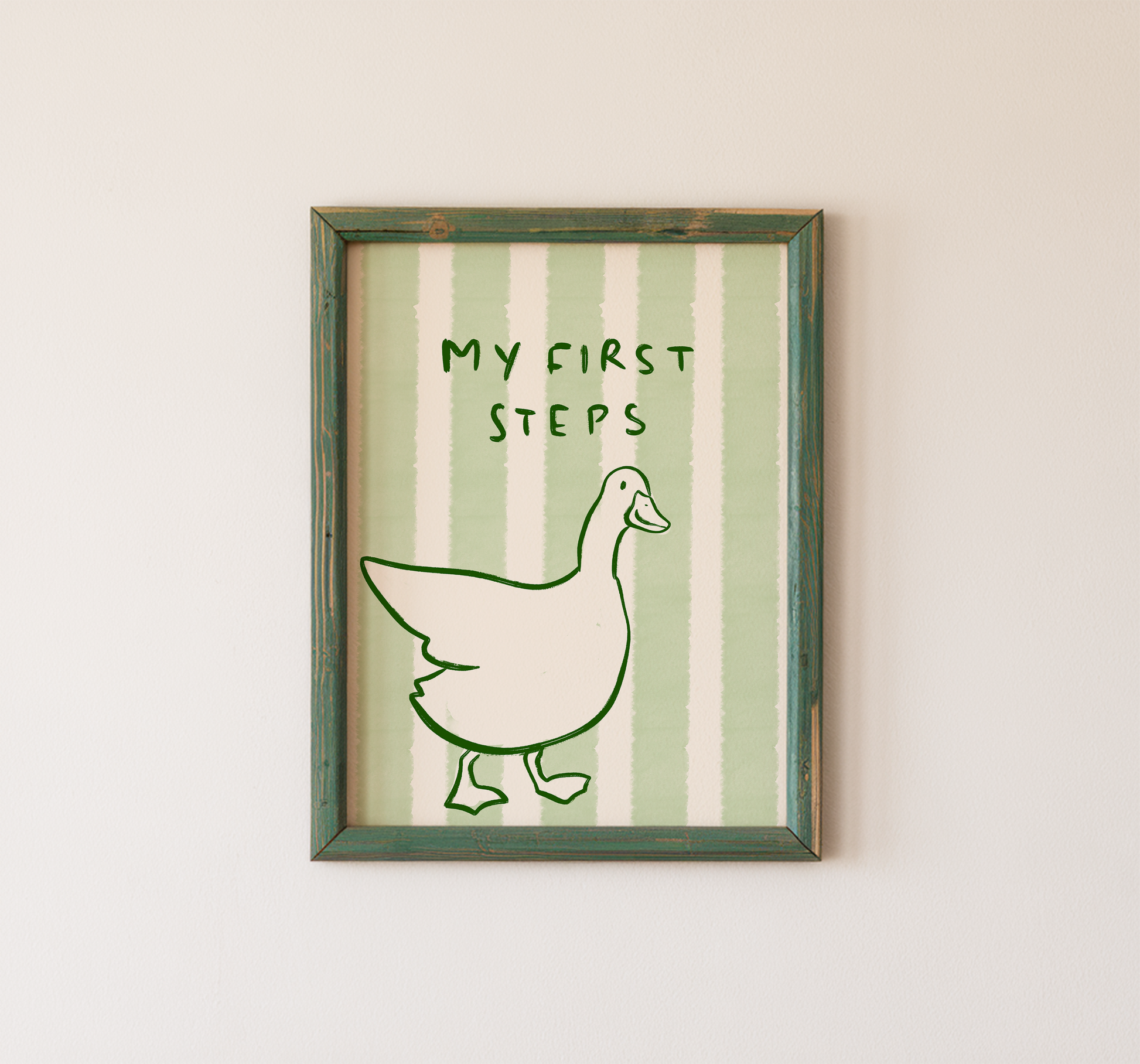 Celebrate tiny milestones with this sweet physical wall art print. This duck nursery wall art features the words "My First Steps" with a minimalist duck on soft green stripes.