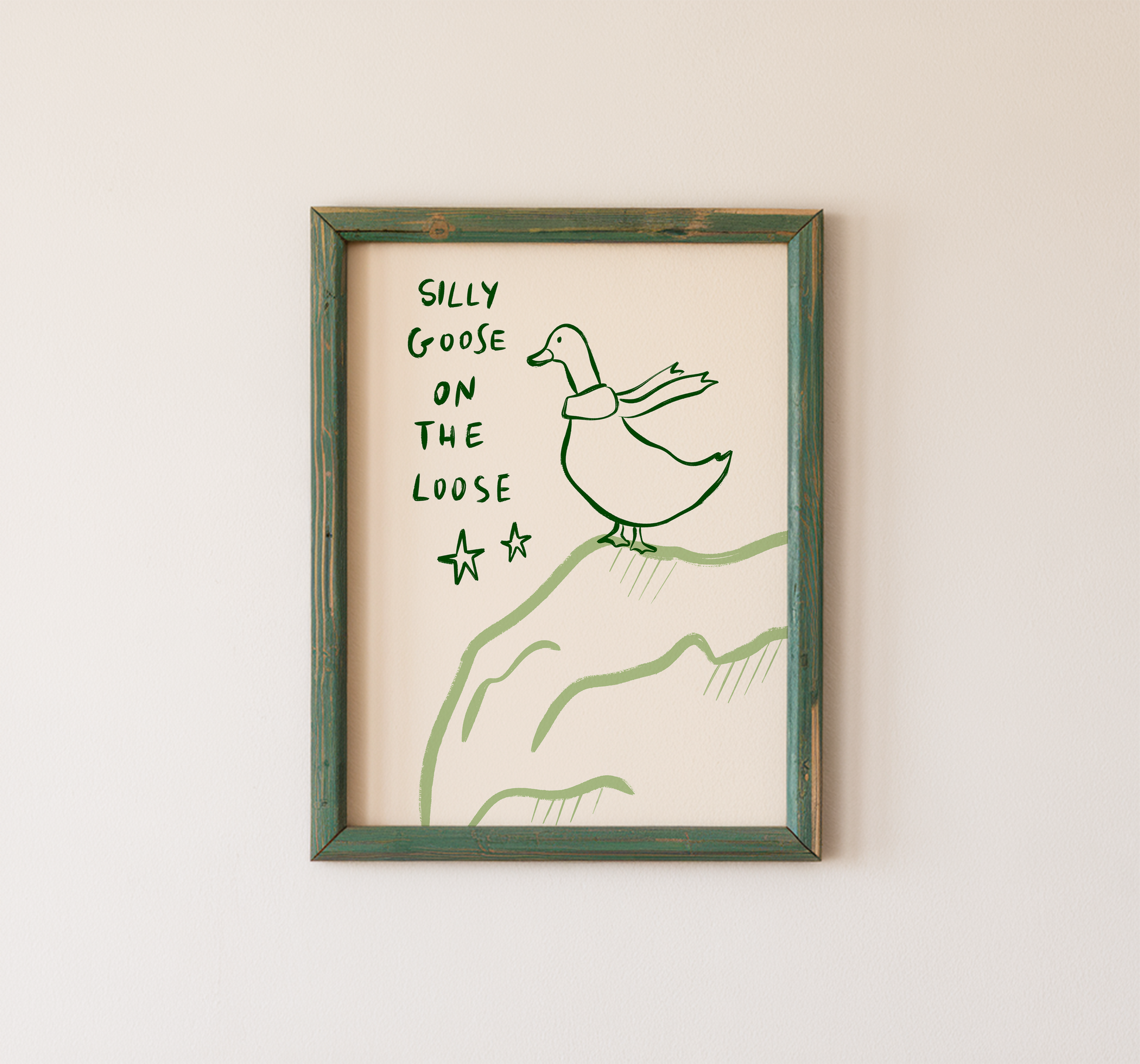 Bring a little mischief to your walls with this funny goose wall art, featuring a hand drawn goose and the phrase "Silly Goose on the Loose." This is a physical wall art print designed to add a playful, lighthearted touch to your space.